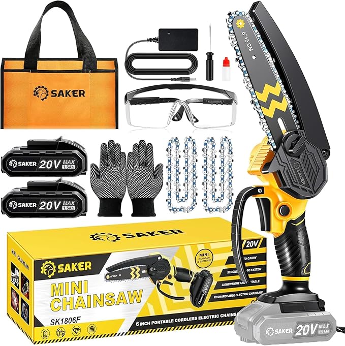 Saker Mini Chainsaw Cordless 6-Inch-Switch Security Lock-Cordless Power Chain Saws-Handheld Small Chainsaw for Cutting Wood Trimming and Woodworking- Mini Chain Saw Cordless with 2 Batteries